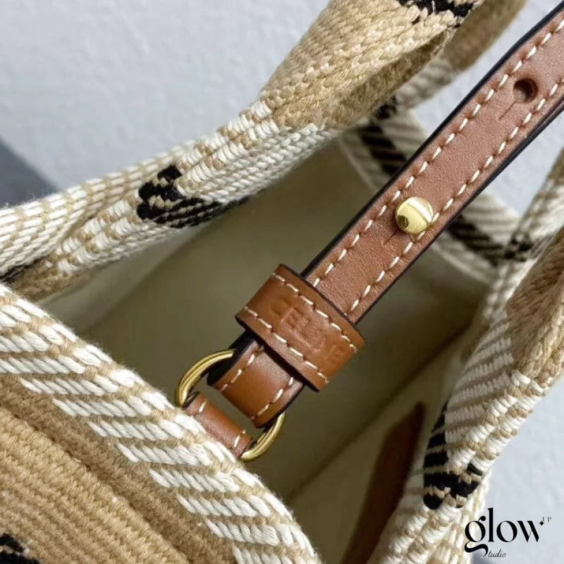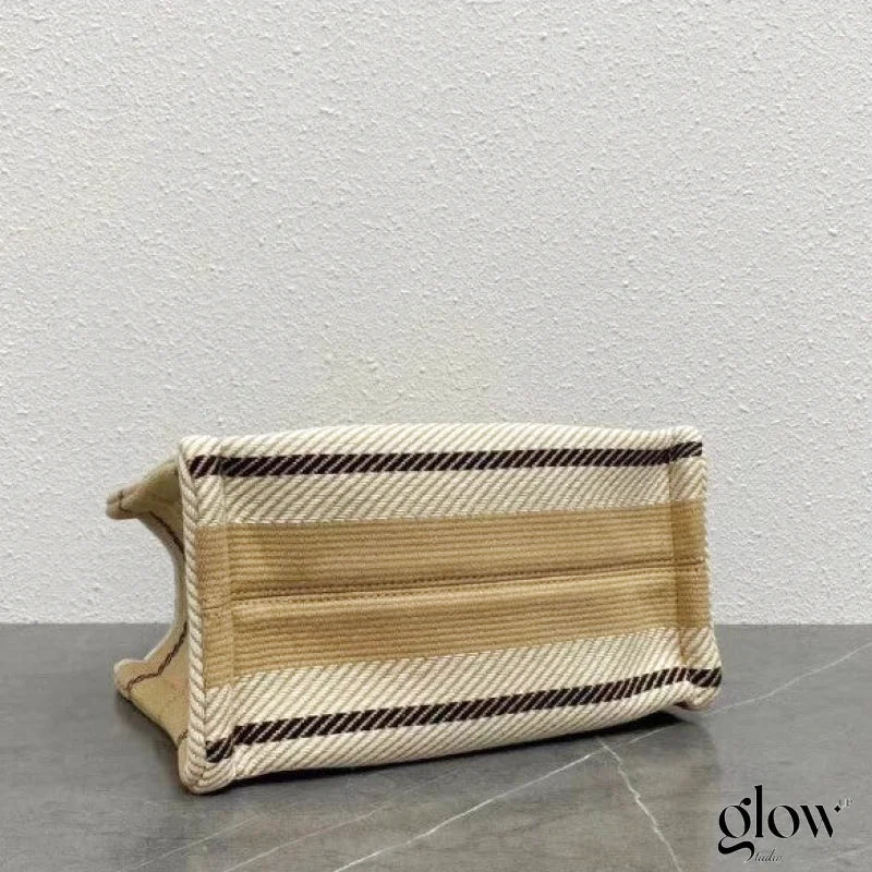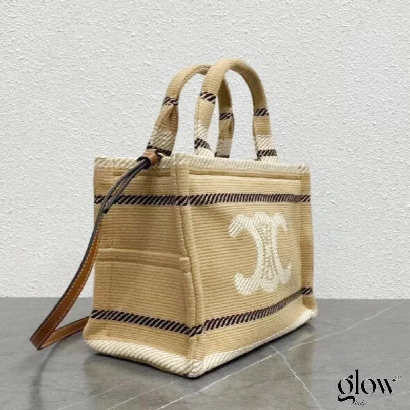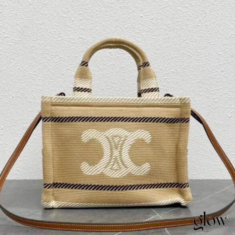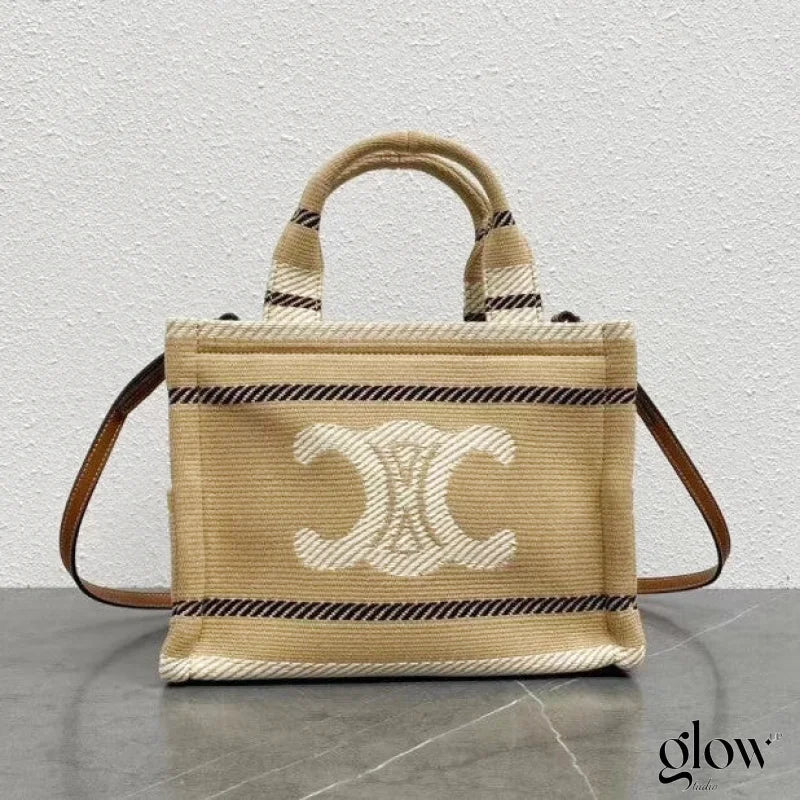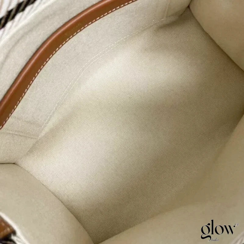 Ce cabas élégant combine un textile rayé beige et noir à des finitions en cuir de veau, pour un style à la fois minimaliste et raffiné. Léger, souple et facile à porter, il s’adapte parfaitement à un usage quotidien avec une touche de luxe discret.