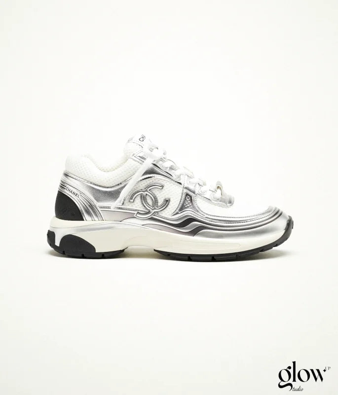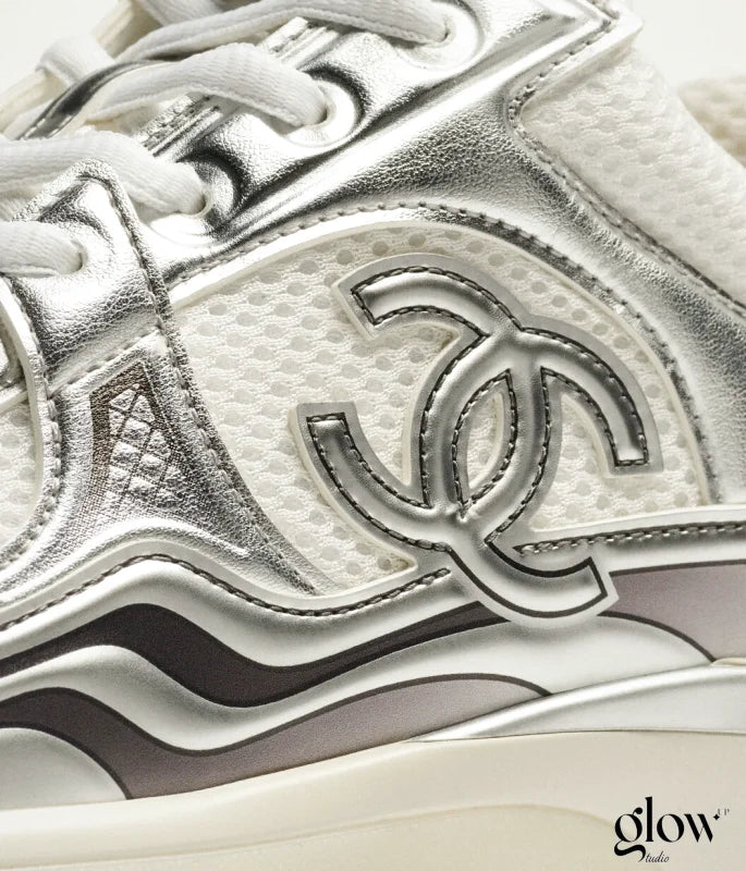 Les baskets Chanel tissu & laminé blanc argenté sont faites pour celles qui kiffent les détails qui brillent sans jamais tomber dans le criard, et qui veulent marcher *différent*.